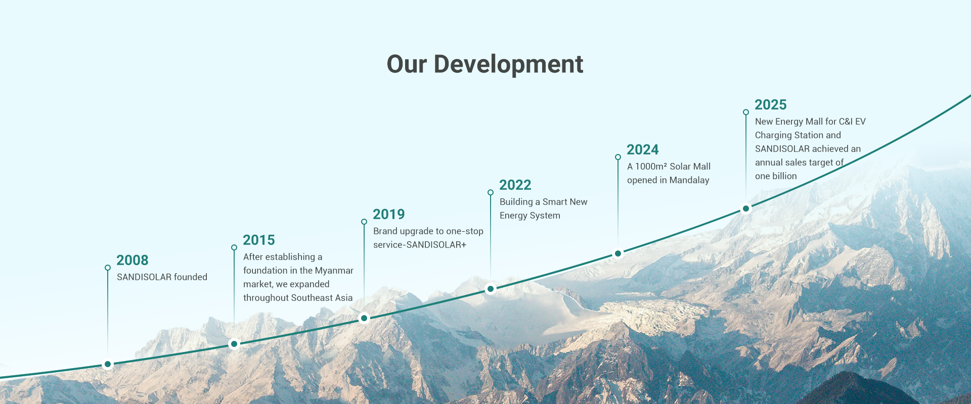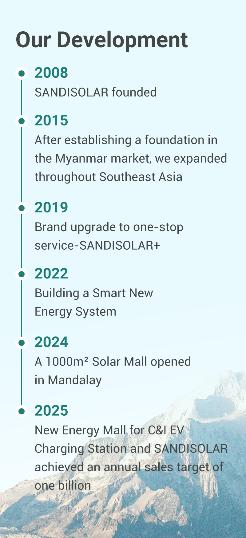 SANDISOLAR a été fondée à 2008 et est une entreprise de haute technologie dans la recherche, développement, production, et la vente de produits tels que les modules photovoltaïques, Onduleurs, Piles, énergie, Systèmes de stockage, Recharge des VE, et de nouvelles applications énergétiques. Mise à profit de produits leaders du secteur et d’un système intelligent de gestion de l’énergie, notre entreprise a pénétré les nouveaux marchés de l’énergie au Myanmar et en Thaïlande, offrant d’innombrables foyers et industries & Entreprises commerciales : une solution énergétique intégrée et unique couvrant l’ensemble "recharge-stockage solaire" Spectre — apporter véritablement de l’énergie propre à des milliers d’usines.